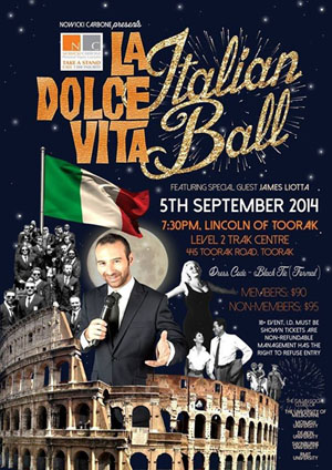 Some of the festivals James is booked to M.C include: Australia Day-Whittlesea | Darebin Community Festival | Darebin Beer and Wine Festivak | Whittlesea Festival | Lalor Multicultural Day |Craigieburn Festival | Glenroy Festival | Fawkner Festival | Broadmeadows Festival | La Dolce Italia Festival | Lygon Street Festival | Carlton Italian Festa | Adelaide Carnevale Festival | Melbourne National Italian Day | Sydney National Italian Day | Sydney Primo Festival | Hobart Italian Festa | Well Bread Festival | Carols By Candlelight-Whitlsea | Carols in Piazza Carlton | St Paul’s Festival | Comfy Shorts Film Screenings | Angry Film Festival | Made In Melbourne Film Festival |Viva Victoria Multicultural Festival | Amazing Race Thomastown Family Day | Winter Wonderland Family Day | North Balwyn Multicultural Festival | Whittlesea Show | Lalor Multicultural Festival | Sydney Ferragosto Festival. Plus a long list of charity and dinner dances!